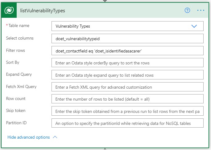 One of the most important things to remember when building a flow is to set up the parameters correctly, or defining your query. The more specific you are the better, as the flow will know exactly how and where to perform the actions. When you start defining the trigger, you first need to select the entity (table) and then it is very important you specify the ‘Colum filter‘ (previously called Filter query). And in some cases if you need to be more specific, you could add the ‘Row filter‘ (previously called Expand query).