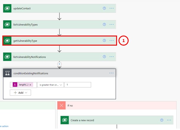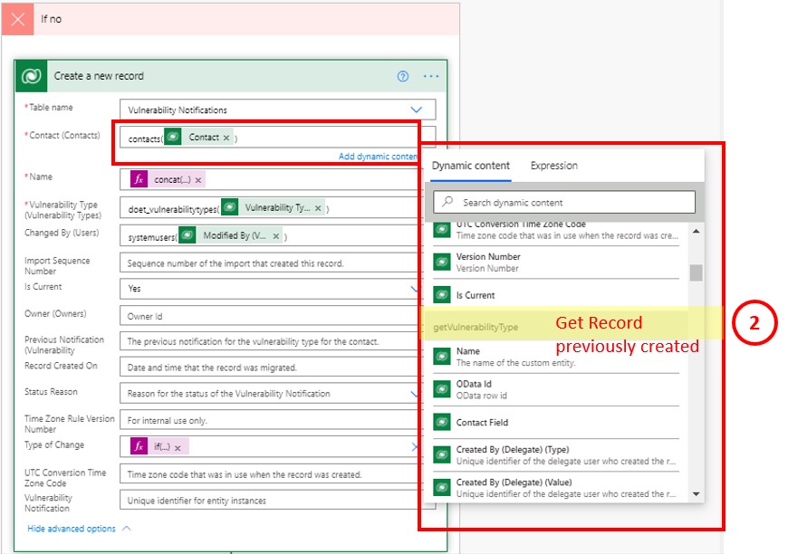 For instance, I have a flow where I have added a list of an entity called “Vulnerability Type” and I have narrowed the query to get only the first element on that list. Then, I’m creating a condition, and in the ‘Yes’ path of that Condition, I’m telling the system to create a new record. Note that the Dynamic Content you see in the image is bringing the values of components I have previously added into my flow and you can notice because of the name of that component. So, because I have previously added the getVulnerabilityType (‘Get record’ component), I’m able to bring any value retrieved from that entity and it’s query. This option allows you to add a Dynamic Content (of that related entity) instead of a fixed value within your form.